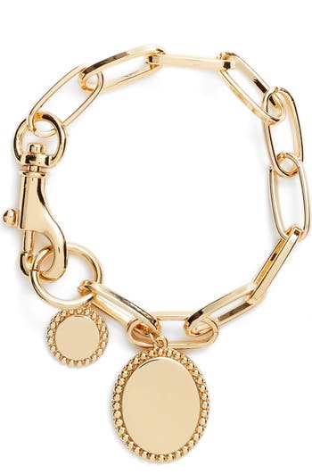 Two medallion charms with a bead-carved frame jangle from the wide-link chain of this elegantly feminine bracelet that brings a rich gleam to your wrist.