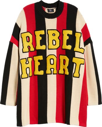 Make a retro-chic statement in this oversized sweater featuring dropped shoulders, crisp stripes and vibrant lettering across the chest.