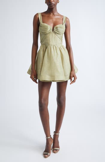 Inspired by nostalgic pirate tales and the drama of the New Romantics, this minidress from the fantasy-driven 'Twisted Romance' collection evokes a world of escape, imagined in light and movement. Crafted from linen-silk organza with draped details, internal boning and a full, flared skirt, it expertly uses house codes to explore the tension between softness and structure.