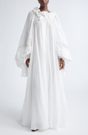 Steeped in the nautical escapism of the 'Twisted Romance' collection, this ramie maxi dress flows with signature boho romance from the ruffled collar down to the billowing hem. Voluminous sleeves accented with cords and pleats enhance the dimension of the free-spirited style, while a removable waist tie gives the option for a more defined silhouette.