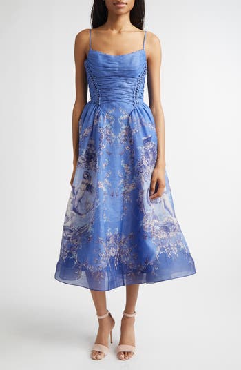 This romantic linen-silk midi dress evokes the nautical escapism of the 'Twisted Romance' collection with a captivating mermaid print and beaded rouleau trim that glints like treasures salvaged from the sea. The boned corset bodice counterbalances the full, crinoline-lifted skirt.
