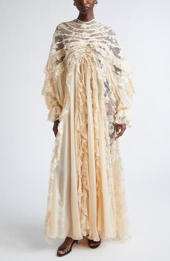 Rebellion Splice Long Sleeve Lace Ruffle Silk Maxi Dress