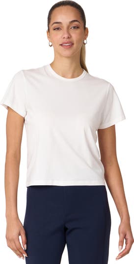 Meet your new go to crop tee that effortlessly pairs perfectly with leggings. A wardrobe staple that is made in soft pima cotton, cool to touch modal, and a hint of stretch for ultimate comfort and style. Biocompact finish keeps the fabric long lasting and smooth.