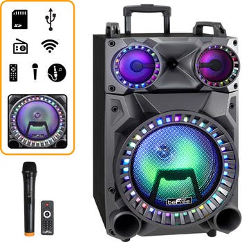 The beFree Sound Rechargeable 12" Bluetooth Portable Party Speaker with Party Lights, FM Radio and USB/TF Inputs is the best choice for an all-in-one entertainment experience! This portable speaker conveniently features hard mounted top handles for your convenience, as an extendable handle and caster wheels for easy portability, making carrying this speaker a breeze. This unit is the ideal companion for your hardest workouts and wildest parties! With a hard-hitting base line, it delivers thunderous crystal-clear sound. With the built-in sound reactive lights, this sound system is sure to pump up the party! While your guests may already enjoy your music selections, this speaker will help you take your entertaining to higher level. Easily connect a variety of devices, and choose the input that is best suited to your needs. You always have the option of turning down the reactive light show whenever needed, while still enjoying the strong, clear sound provided by woofer and tweeters. This unit acts incredibly well as a portable PA system, with the included wireless microphone included, you'll really be able to make your voice heard! 12" Portable Speaker One 12" Woofer Two 4" Tweeters 60 Watts Colorful party lights TF Compatible USB Compatible Bluetooth Compatible AUX Compatible One Wireless Microphone Included Remote Control Included 4.5ah Rechargeable Battery Charge time: 8-10 hours Playtime: 3-5 hours per charging cycle, depending on use of lights and/or volume Item Measurements: Speaker: 27" height, 15" width, 12" depth, 26lbs weight Item Dimensions: 27.00" x 15.00" x 12.00" Item Weight: 26.00lbs