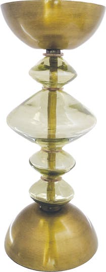 - A gorgeous pillar candle holder with a green reclaimed glass top and a metal base with an antique gold finish