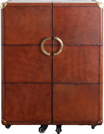 Reclaimed Wood and Leather Bar Cabinet on Caster Wheels with Flocked Interior, Cognac Color