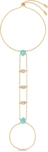 Reconstituted turquoise and cubic zirconia emit color and sparkle from this 18-karat gold plated hand chain that brings eye-catching drape to your ensemble.