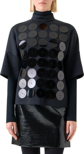 This top turns the brand’s signature dot motif into a bold visual symphony of scale and shimmer. Oversized sequins reflect light like modern armor, while the boxy shape, mock neck and elbow-length sleeves lend a clean, contemporary feel.
