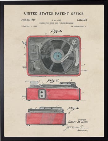 This vintage-inspired print, framed in a black wooden frame, features a record player patent. Sized at 16 inches by 20 inches, this made in the USA frame makes for a beautiful addition to any wall.