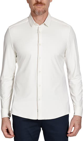 Made of stretchy nylon-spandex, this slim-fit shirt features long sleeves, button cuffs, and a classic collar.