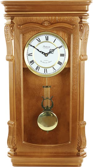 Bedford Clock Collection offers you the elegance and beauty of classic style with the modern reliable technology of today's wall clocks. Whether a gift to yourself or for someone else, this clock will add a special touch of sophistication to any room. With it's stunning Golden Oak finish, Golden Accents and Swinging Pendulum, this time piece is not only an attractive focal point, but a functional and reliable piece of technology. With 4 distinct Chimes, the clock will announce the beginning of each new hour for your convenience. Carved details and special touches throughout, as well as a convenient Sleep Mode. Item Dimensions: 13.60" x 5.40" x 25.60" Item Weight: 10.50lbs