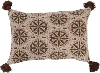 - This global-inspired lumbar pillow cover showcases a striking floral medallion print on recycled cotton, finished with decorative tassels
