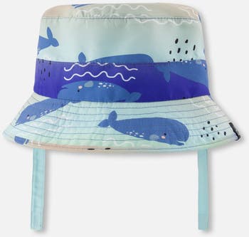 The recycled polyester beach hat in blue with whale print is a fun and practical essential for boys and baby boys. This sun hat features a wide brim, under-chin straps, and an allover whale print that brings the ocean to life. Made from recycled polyester with a soft lining, it offers comfort and protection under the sun. A playful piece from our “Like A Fish To Water” collection, perfect for seaside adventures. Please note that there are no drawstrings in children's size 2/3 & 4/5.