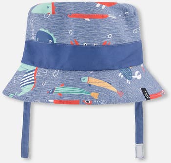 The recycled polyester beach hat in blue with printed marine animals is a fun and practical essential for boys and baby boys. This sun hat features a wide brim, under-chin straps, and an allover printed marine animals that brings the ocean to life. Made from recycled polyester with a soft lining, it offers comfort and protection under the sun. A playful piece from our “Like A Fish To Water” collection, perfect for seaside adventures. Please note that there are no drawstrings in children's size 2/3 & 4/5.