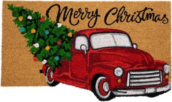 Welcome your guests this holiday season with this truck and Christmas tree outdoor doormat. This charming doormat features a festive red vintage style truck carrying a Christmas tree and the words "Merry Christmas" written in black cursive letters. Made from durable natural coir fibers, this doormat is perfect for outdoor use and will help keep your floors clean and free of dirt and debris. Add a touch of holiday cheer to your doorstep with this delightful doormat. Product Features: Rectangular Christmas doormat Features a vintage-style truck hauling a decorated Christmas tree Printed with the words "Merry Christmas" Tufted and printed doormat Non-skid durable backing helps to keep your doormat securely in place Heavy-duty and durable construction Coir is eco-friendly, resistant to fungi, resilient, static-free, fast drying and easy to clean Care instructions: sweep or lightly hose clean, air dry Recommended for indoor and outdoor use Dimensions: 0.75"H x 18"W x 30"L Material(s): coir/PVC
