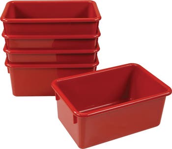 This set of vibrant red storage bins is an ideal storage solution to keep your space organized and clutter-free. Constructed from quality polypropylene, these precision-molded storage trays are durable. Maximize your space and store books, toys, pencils, stickers, papers, and more! Stack these bins or store them in a cubby. Lids are sold separately. Bins measure 8.5"W x 5.5"H x 12.625"D.