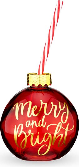 Rock around the Christmas tree with the Ornament Drink Tumbler by Blush. Made out of luminous red glass, this is the perfect thing to sip from at your next holiday party. The shimmering gold script stands out no matter what liquid you use to fill the ornament shaped globe. A hanging clasp accent in gold completes the look, while a peppermint stripe reusable plastic straw gives you easy access to your holiday punch. Plus, a rounded base makes this tumbler comfortable to hold, no matter how long the party goes. Why should the tree be the only one with ornaments? Decorate your holiday beverages this year with the Ornament Drink Tumbler by Blush.