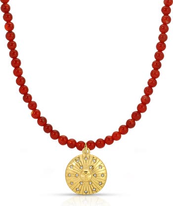 Carnelian and 14-karat-gold plating give a warm flush of light and color to this sun-inspired necklace winking with cubic zirconia.