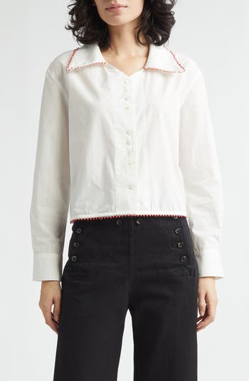 Red bud passementerie traces the wide spread collar and hem of this poplin shirt with an attached sash that allows for a cinched fit or peplum-flared silhouette.