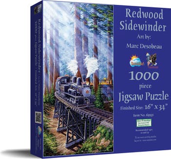 Immerse yourself in a scenic journey through nature with the Redwood Sidewinder 1000 Piece Jigsaw Puzzle by SunsOut. The intricate artwork by Marc Desobeau captures a classic train weaving through majestic redwoods in a stunning 16"x34" masterpiece, perfect for art enthusiasts. Each piece interlocks with precision, courtesy of high-quality recycled cardboard, offering a seamless fit and immersive puzzle experience. SunsOut maintains respect for the environment through the use of eco-friendly soy-based inks, resulting in vibrant colors. Proudly made in the USA, the Redwood Sidewinder comes backed with a worry-free guarantee for any missing or damaged pieces, showcasing SunsOut's commitment to quality and exceptional customer service. Ideal for train enthusiasts and nature lovers, the Redwood Sidewinder presents an intriguing blend of nature and transportation. Take on the challenge and unearth the intricate story, whether as a relaxing activity or a shared experience with loved ones, you are guaranteed endless hours of joy, culminating in a breathtaking scene at completion.