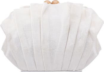 Gentle gathers create a seashell-inspired silhouette on a whimsical clutch featuring an optional chain strap for hands-free wear.
