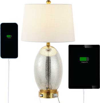 - This lamp base boasts a USB charging port for mobile devices and contains an outlet for charging all other electronic devices (Phone is not included)