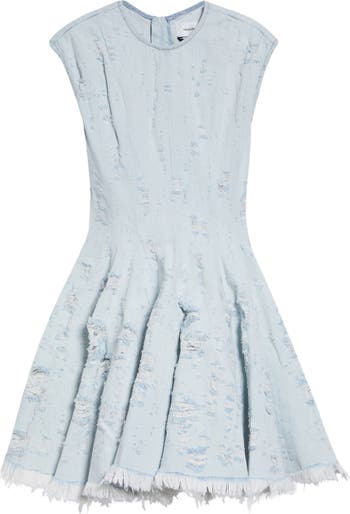 Small rips graduate in size to large ones at the flouncy skirt of this denim dress fitted with princess seams and fashioned with fringey raw edges along the hemline. It's finished with a heavy bleach wash for a lightened hue and enhanced distressing.