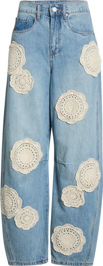 A crochet-like embroidery stands out against the faded wash of these barrel-leg jeans cut with a high waist from nonstretch denim.