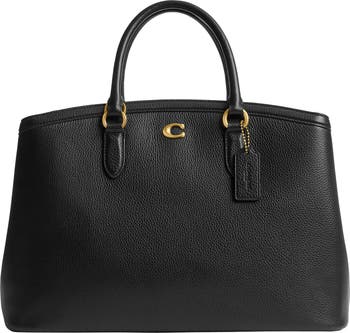 Aged-finish hardware and clean lines highlight the richly pebbled leather exterior of a structured tote featuring multiple compartments and an optional crossbody strap perfect for your next weekend getaway.