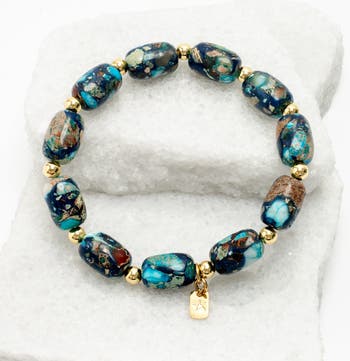 Our Reflections of Hope Bracelet shimmers with hand-strung emperor stone beads in vibrant blues, turquoise, and warm auburn tones—like sunlight dancing across refreshing pools of water. Designed with effortless stretch for easy wear, this meaningful bracelet adds beauty whether worn solo or stacked with your favorites. Each bead reflects a survivor’s journey of transformation. As she learns to craft pieces like the Reflections of Hope Bracelet, she discovers new skills, confidence, and the opportunity to begin a life of freedom. Your purchase is a part of that radiant story. Materials: emperor stone bracelet with 14k gold plated stainless steel accents Hypoallergenic; lead and cadmium free with nickel content less than 100 ppm. Size: 9 inches