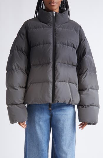A gradient reflective finish defines this oversized, cropped puffer built with channel quilting, a stand collar and a bungee-drawcord hem to cinch it in.