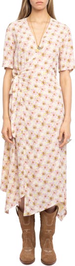 A garden's worth of blooms springs forth against a canvas of fluid, lightweight crepe on this asymmetric wrap dress rooted in easygoing romance.