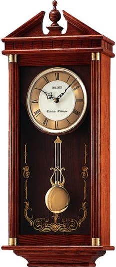 Seiko Regal Oak Wall Clock with Pendulum wall clock with intricate wooden carvings and gold details will upgrade your home. It also has columns on each side and metal accents. It chimes every quarter-hour with hourly strikes and has adjustable volume that can be silenced during the night. Powered by 1 C battery (included). Overall dimensions: 28.25 X 11.75 X 3.75 inches. Quartz crystal movement allows for the most accurate time keeping. Perfect accent to add to any home or office.