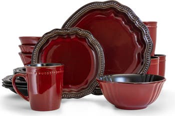 Add a regal touch to your dining table with the Elama Regency 16 Piece Dinnerware Set in Red. Each dish is creatively crafted into unique and contemporary shapes and beautifully colored in vibrant red with gold accents. From sophisticated dinner parties to casual dining, make your dinnerware collection become a staple piece for your kitchen. Each plate is microwave safe for quick reheating and dishwasher safe for easy cleaning.Set for 4 people