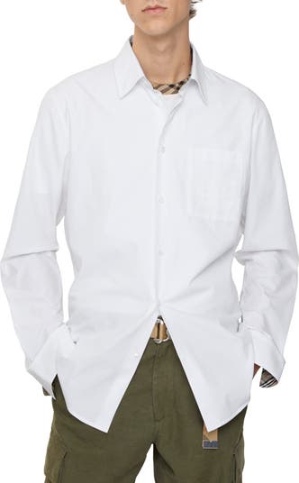 A long-sleeved shirt in cotton poplin, cut to a regular fit. The style is embroidered with a tonal Equestrian Knight Design and our logo. Fold back the cuffs to reveal the Burberry Check lining in signature sand beige.||Button closure|Point collar|Chest patch pocket|Single-button cuffs|Curved hem|Embroidered Equestrian Knight Design at pocket