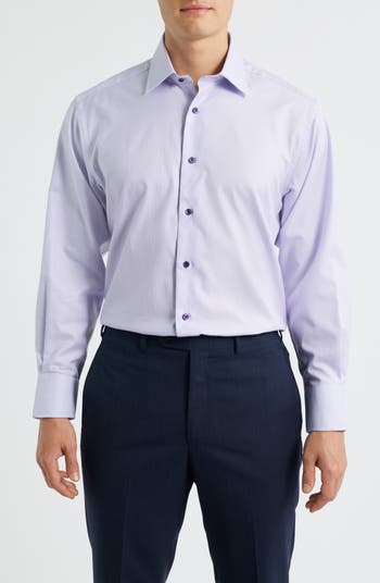 Subtly textured cotton dobby designed in a dusky purple hue brings elevated detailing to a dress shirt styled with a simple French placket for a smart, streamlined look. Crafted with contrast buttons and a midweight feel, it makes a versatile, all-season addition to your semiformal wardrobe.