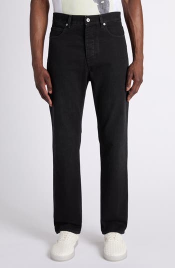 A leather patch embossed with the label's Intrecciato motif brings in-the-know branding to straight-leg jeans cut from nonstretch denim in a black wash featuring subtle fading at the natural wear points.
