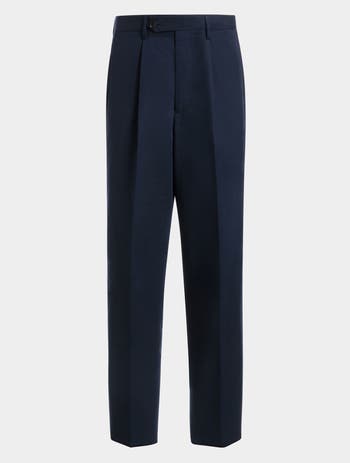 These pleated pants in navy blue cotton-blend fabric have a classic silhouette. A Bally Crest label trims the rear waistband, just above one of the welted back pockets.