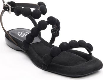 Playful pompoms give dimension and personality to a leather sandal.