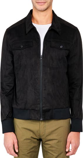 A softly sueded finish adds texture and distinction to a trucker jacket that pairs traditional pockets with a sleek front zipper and warm ribbing around the cuffs and hem. Fully lined and made with a touch of stretch, it brings an elevated, easy-wearing look to your cool-weather outings.