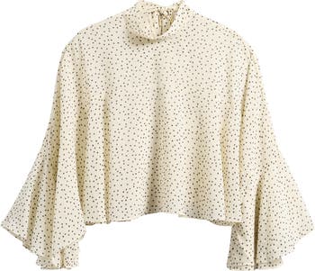 Dramatically flared sleeves dial up the retro attitude of a lightweight woven shirt printed with scattered dots and destined to elevate your look.