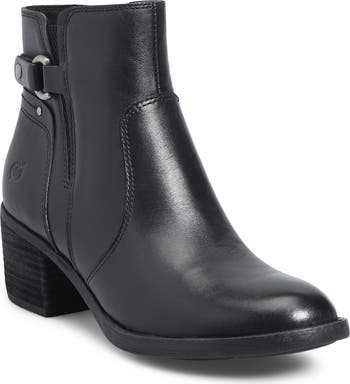 Polished hardware adds a flash of moto edge to a block-heel bootie fashioned from burnished leather and grounded by a comfort-cushioned footbed.