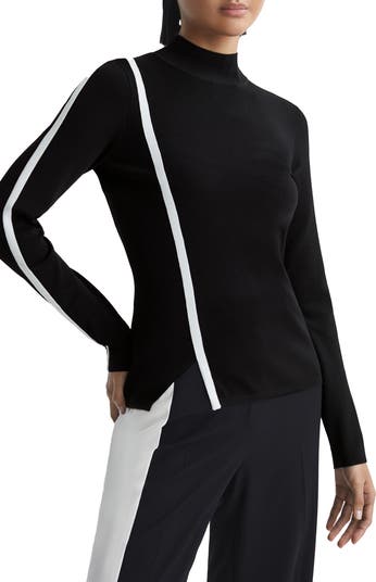 I really like the look of this asymmetric sweater on the model but, if you have any kind of a bust, the stripe down the front creates this odd optical illusion that I did not find flattering on me. Also, the mock turtleneck was just a tiny bit tight (and I don't have a big neck). Disappointed as I really like the style but it didn't look great on me so I returned it. Still a beautiful sweater for perhaps a different body type.