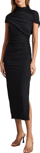 Rippled ruching and a kiss of stretch bring texture and shape to this curve-hugging maxi made with a sophisticated high neckline and abbreviated asymmetric sleeves.