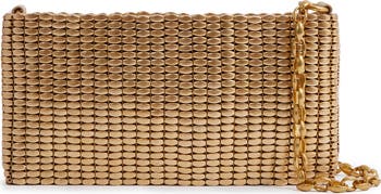 A lustrous exterior adds evening-ready charm to a slender bag fitted with an optional chain strap for hands-free carry.