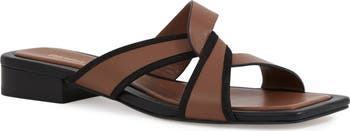 Contrasting trims and interlocking straps bring striking dimension to a leather slide sandal set on a low stacked heel for a hint of height.
