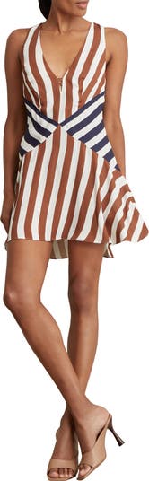 Variegated stripes add striking visual intrigue to this stem-baring dress fashioned in a flirty halter silhouette.