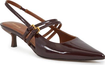 Decorative buckle straps and a pointy toe heighten the modern intrigue of this outfit-elevating slingback sandal.