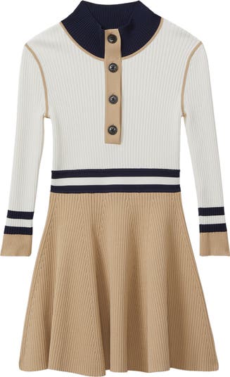 Allover ribbing brings kid-approved comfort to this front-button dress enlivened with placed stripes and colorblocking that highlights the skater silhouette.