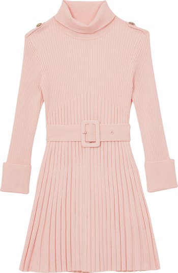 Give your child a sophisticated look with this turtleneck sweater-dress featuring engineered ribs that morph into knife pleats. An optional belt cinches the waist, while epaulets and wide cuffs add extra flair.